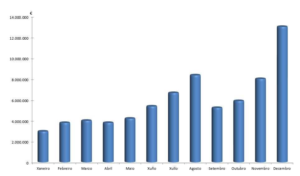 | Xaneiro | Febreiro | Marzo | Abril | Maio | Xuño | Xullo | Agosto | Setembro | Outubro | Novembro | Decembro | Total | |