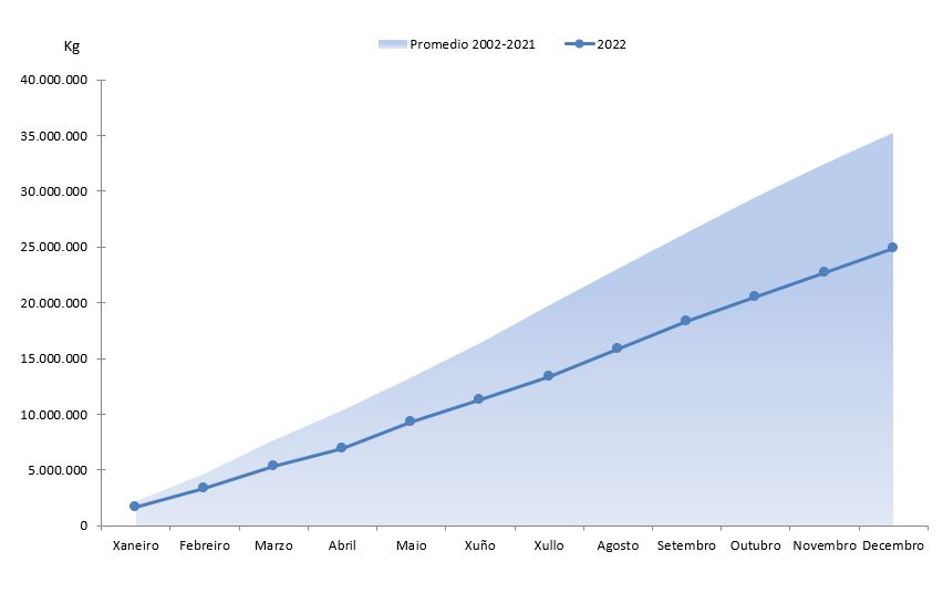 | Equinodermos | 161.489 | 1.999.811 | 202.431 | 2.085.372 | -40.942 | -85.561 | -20,23% | -4,10% |