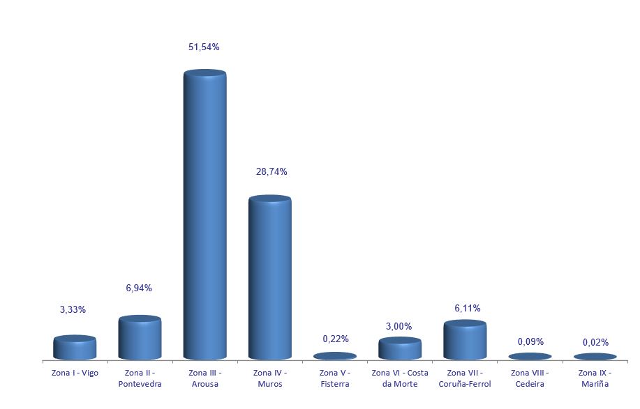 | Zona III - Arousa | 249 | 134.389 | 51,54% | 4.411.794 | 55,40% | 32,83 |