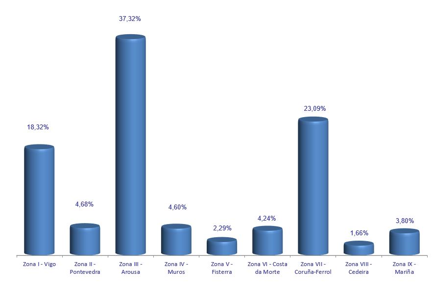 | Zona VI - Costa da Morte | 157 | 29.694 | 4,24% | 236.826 | 3,67% | 7,98 |