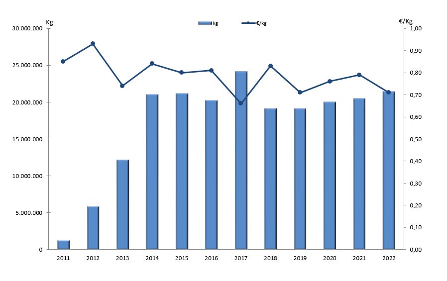 | Zona III - Arousa | 679.937 | 2.533.665 | 5.714.010 | 9.639.093 | 11.051.501 | 12.088.847 | 13.137.922 | 11.362.384 | 11.648.338 | 14.162.026 | 12.079.459 | 15.069.306 | |
