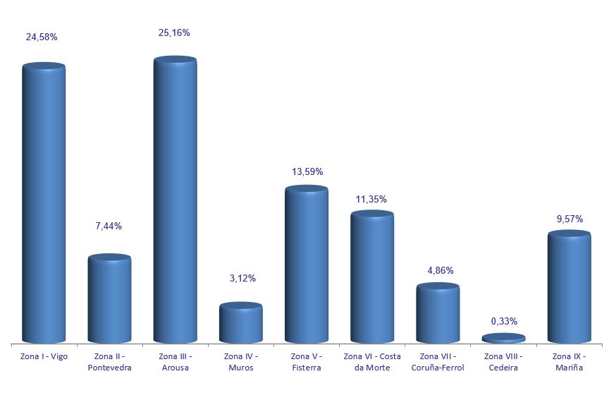 | Zona I - Vigo | 138 | 161.217 | 24,58% | 1.999.090 | 26,72% | 12,40 |