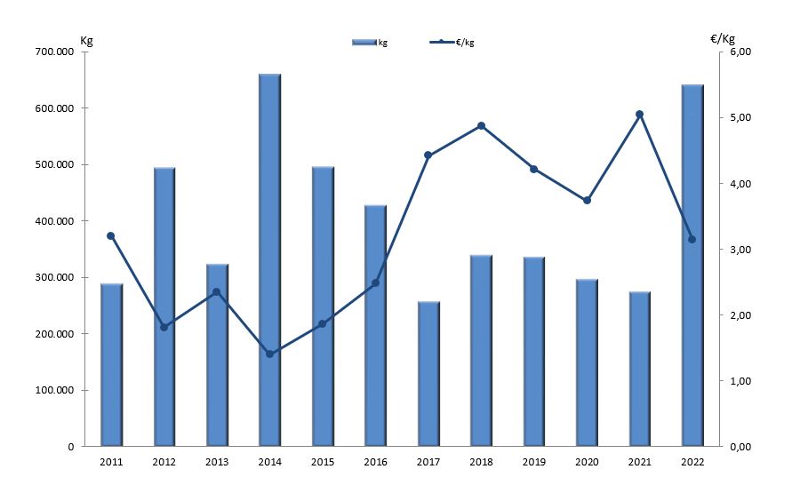 | Centola ou centolo | 143 | 19.471 | 3,05% | 171.167 | 8,51% | 8,79 |