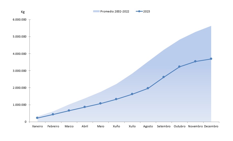 | Bivalvos | 532.174 | 7.680.129 | 545.699 | 6.395.555 | -13.525 | 1.284.575 | -2,48% | 20,09% |