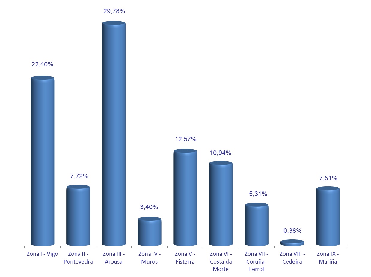 | Zona V - Fisterra | 71 | 79.359 | 12,57% | 908.518 | 11,92% | 11,45 |