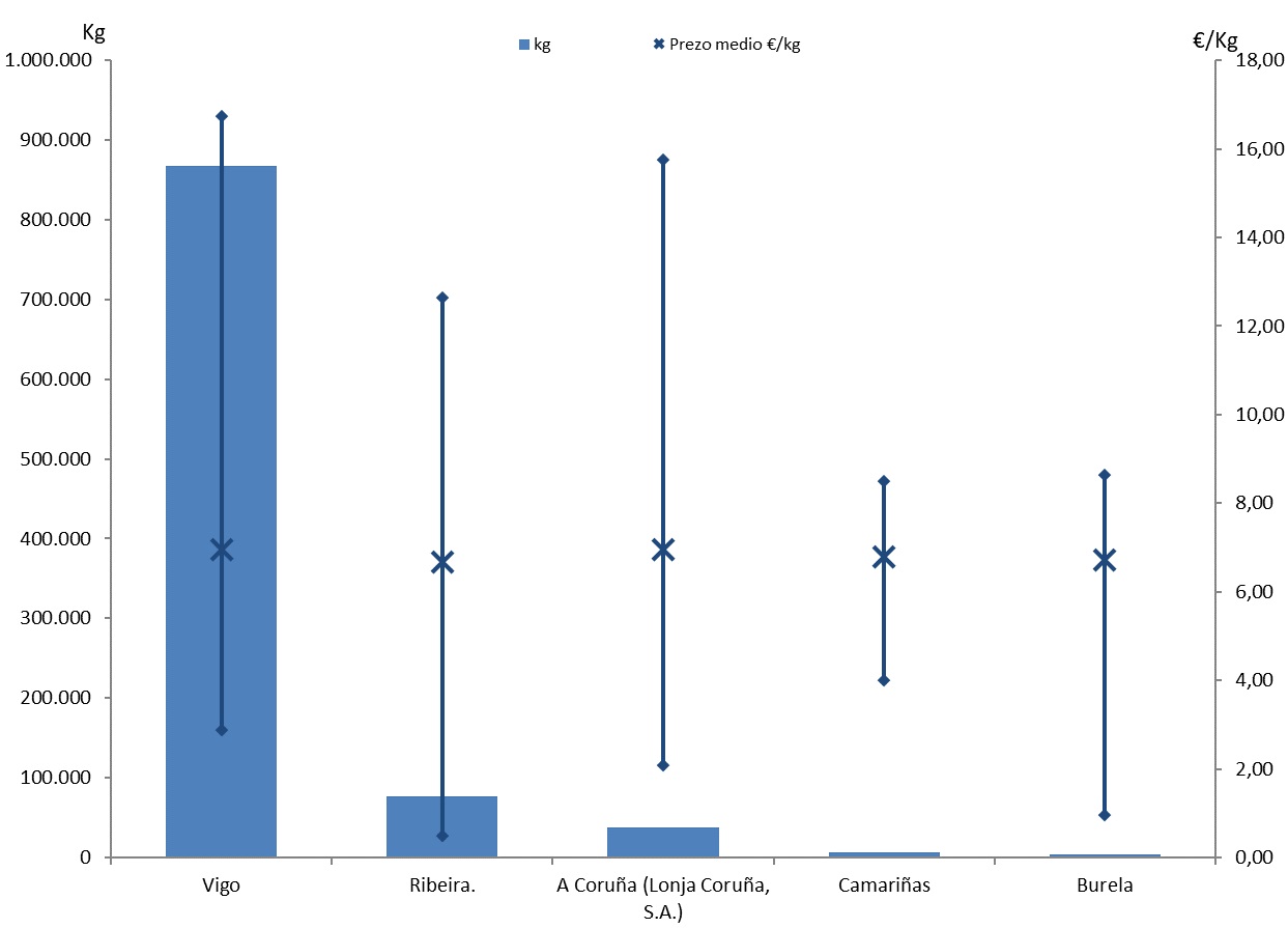 | A Coruña (Lonja Coruña, S.A.) | 95 | 37.133 | 3,73% | 258.256 | 3,74% | 6,95 |