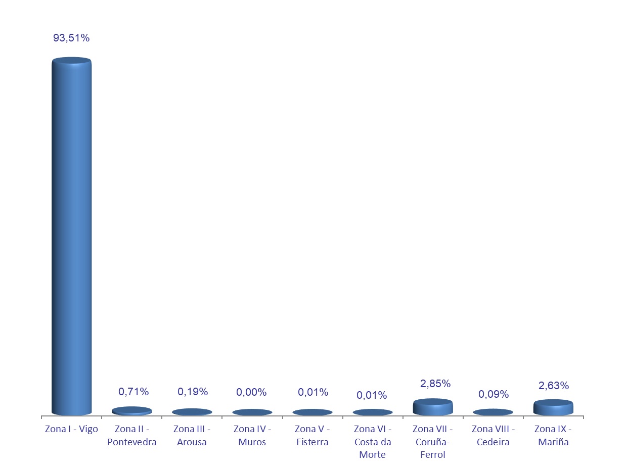 | Zona II - Pontevedra | 238 | 34.583 | 0,71% | 338.235 | 1,27% | 9,78 |