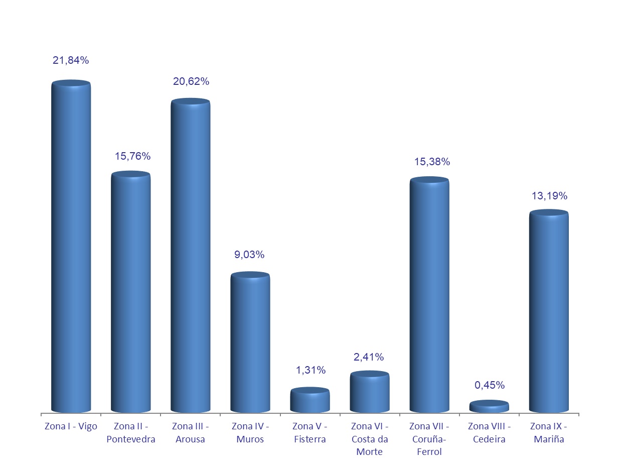 | Zona V - Fisterra | 21 | 23.158 | 1,31% | 12.468 | 1,14% | 0,54 |