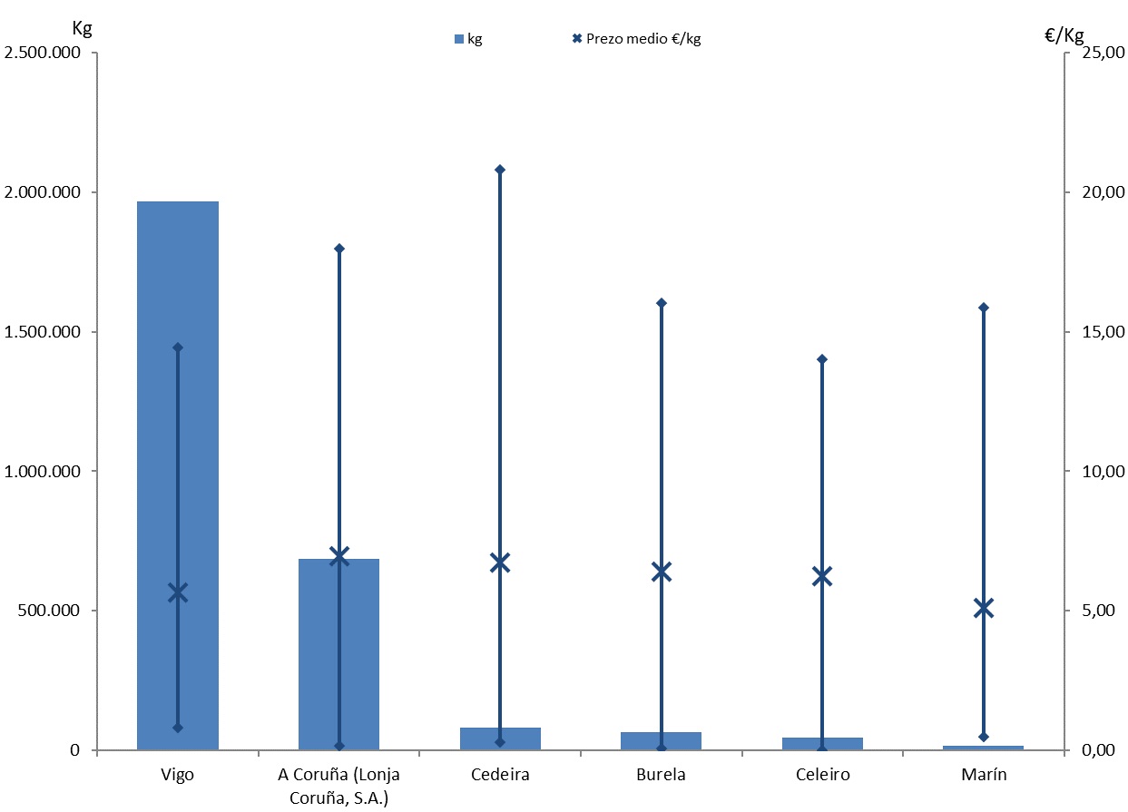 | A Coruña (Lonja Coruña, S.A.) | 283 | 685.202 | 23,76% | 4.766.985 | 27,42% | 6,96 |
