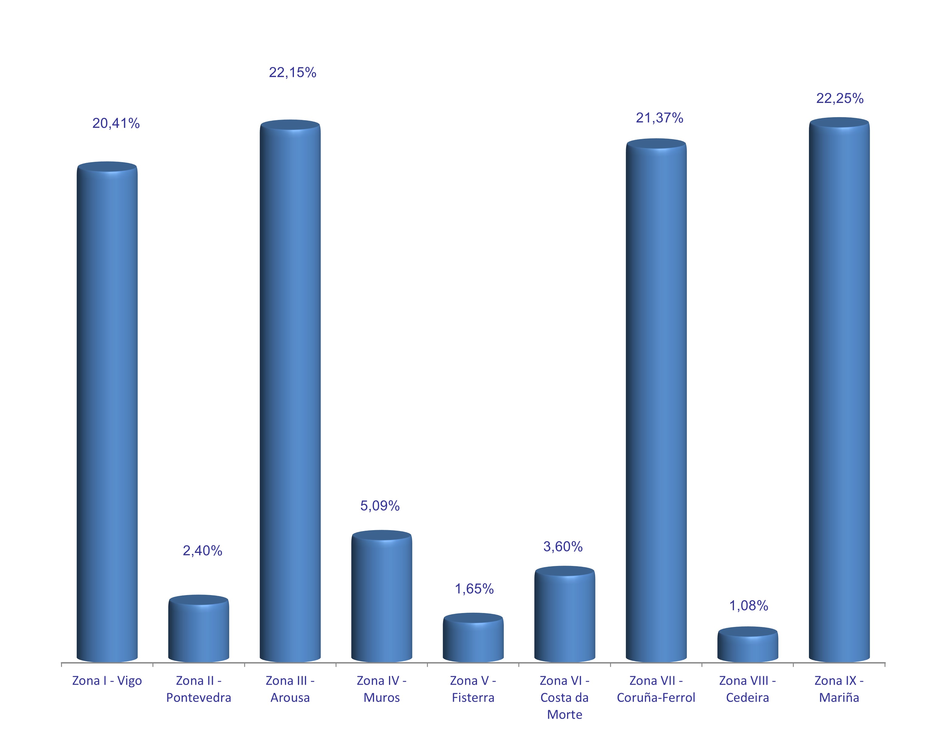| Zona VI - Costa da Morte | 3.683.628 | 3,60% | 8.050.211 | 2,10% | 2,19 |