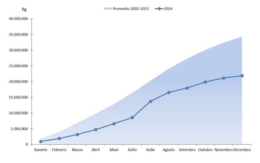| A Coruña (Lonja Coruña, S.A.) | 21.238.169 | 59.581.353 | 24.447.516 | 62.283.169 | -3.209.347 | -2.701.816 | -13,13% | -4,34% |