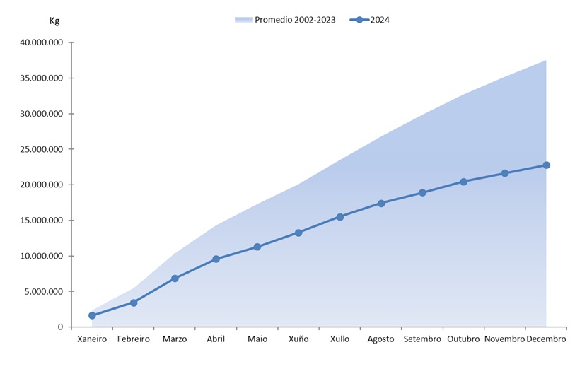 | Crustáceos | 38.868 | 746.667 | 42.073 | 763.341 | -3.205 | -16.674 | -7,62% | -2,18% |