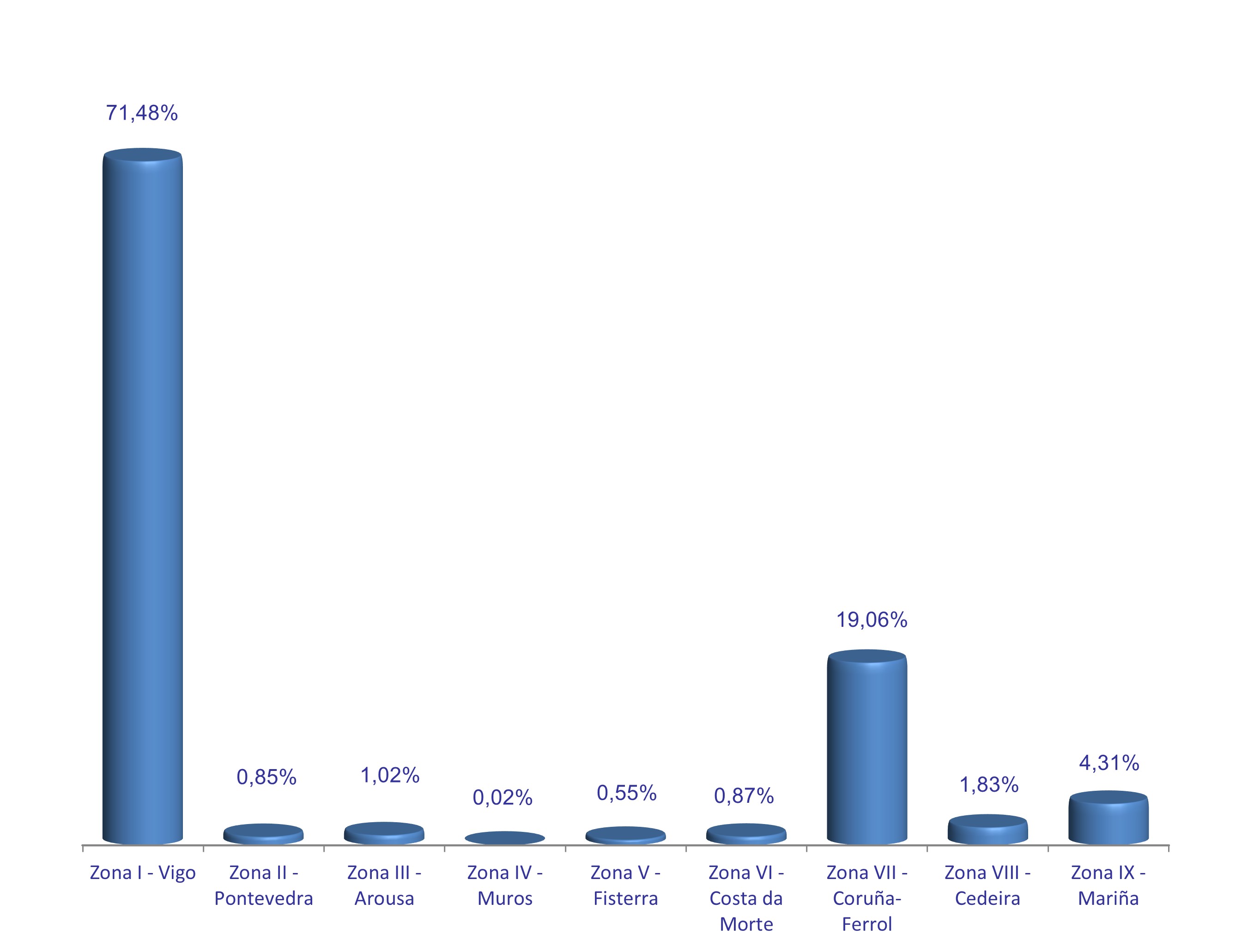 | Zona VI - Costa da Morte | 235 | 25.210 | 0,87% | 116.338 | 0,66% | 4,61 |