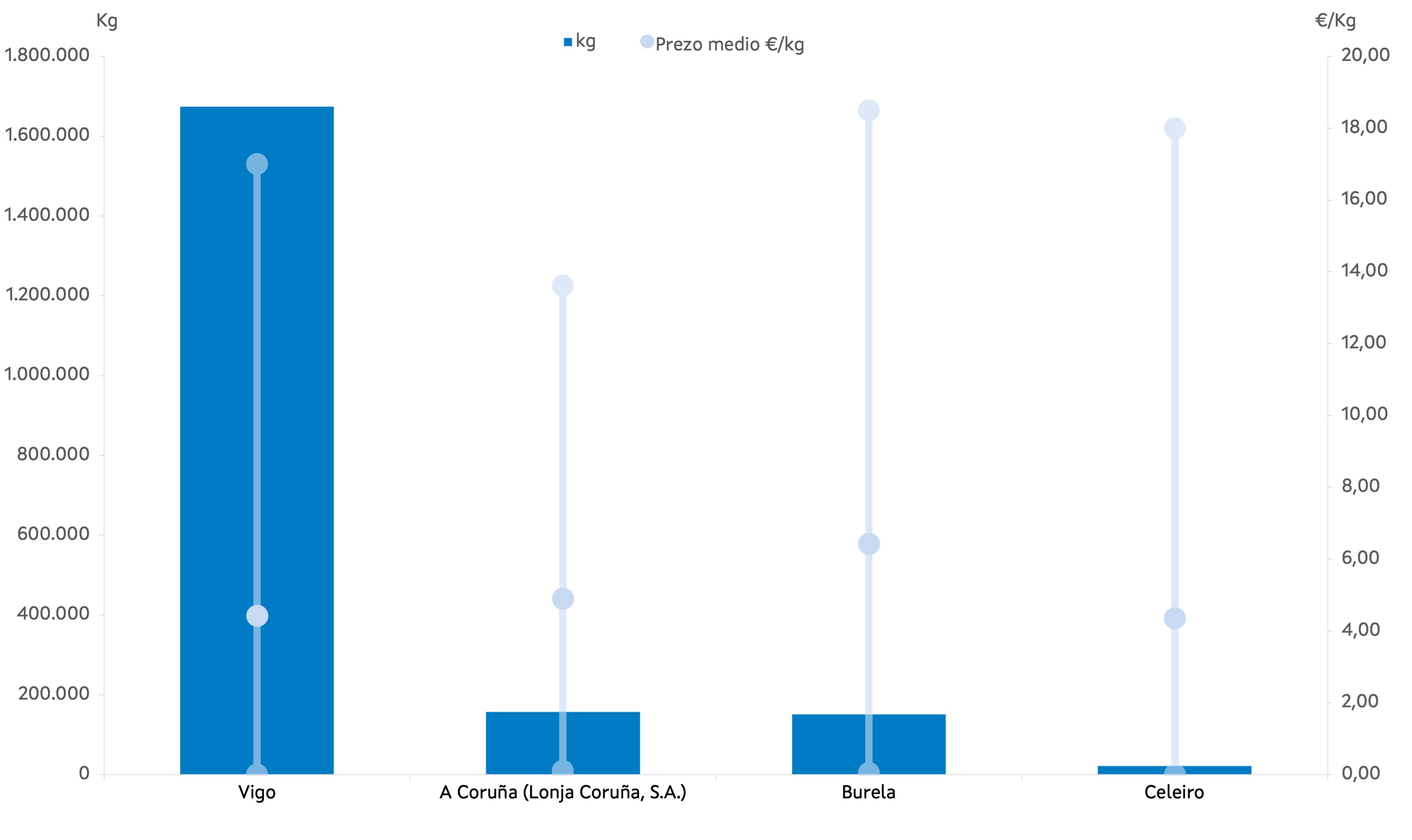 | A Coruña (Lonja Coruña, S.A.) | 261 | 157.567 | 7,82% | 771.342 | 8,31% | 4,90 |
