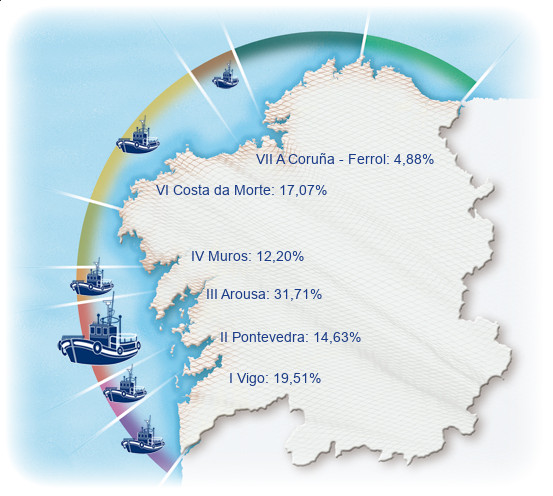 | Zona VI - Costa da Morte | 7 | 16,67% | 17,07% | 2,79% | 50 | 22,37% | 327 | 10,09% |