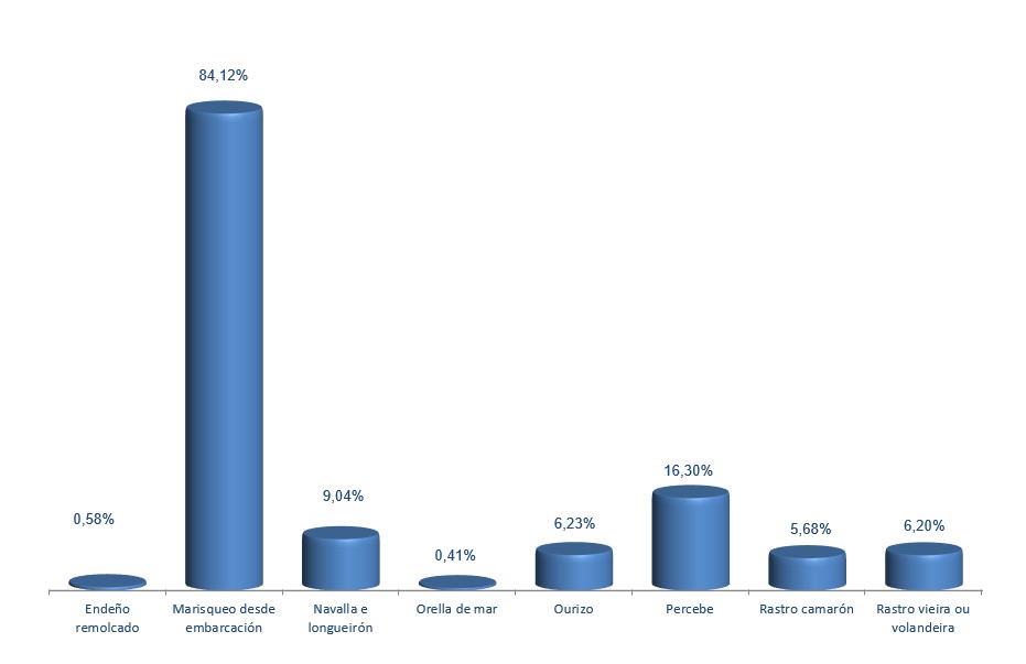 | Marisqueo desde embarcación | 2.457 | -1,05% | 84,12% | 0,06% | 3.207 | -4,13% | 58.593 | -0,29% |