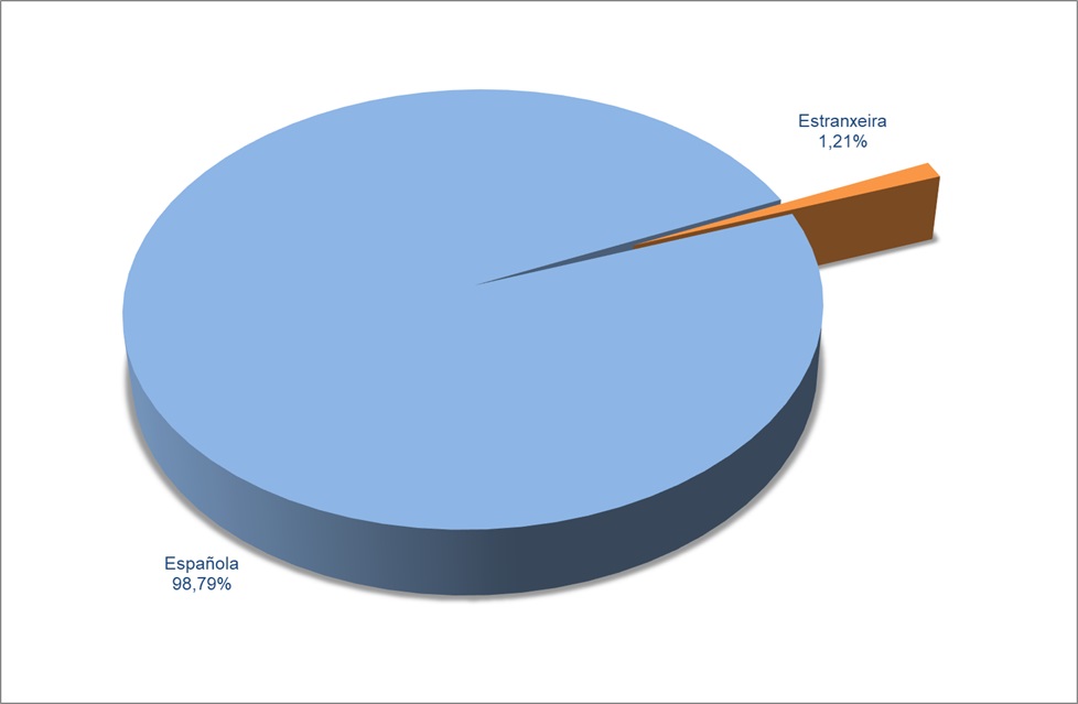 | Estranxeira | 39 | 1,25% | 0 | 0,00% | 15 | 2,43% | 54 | 1,21% |