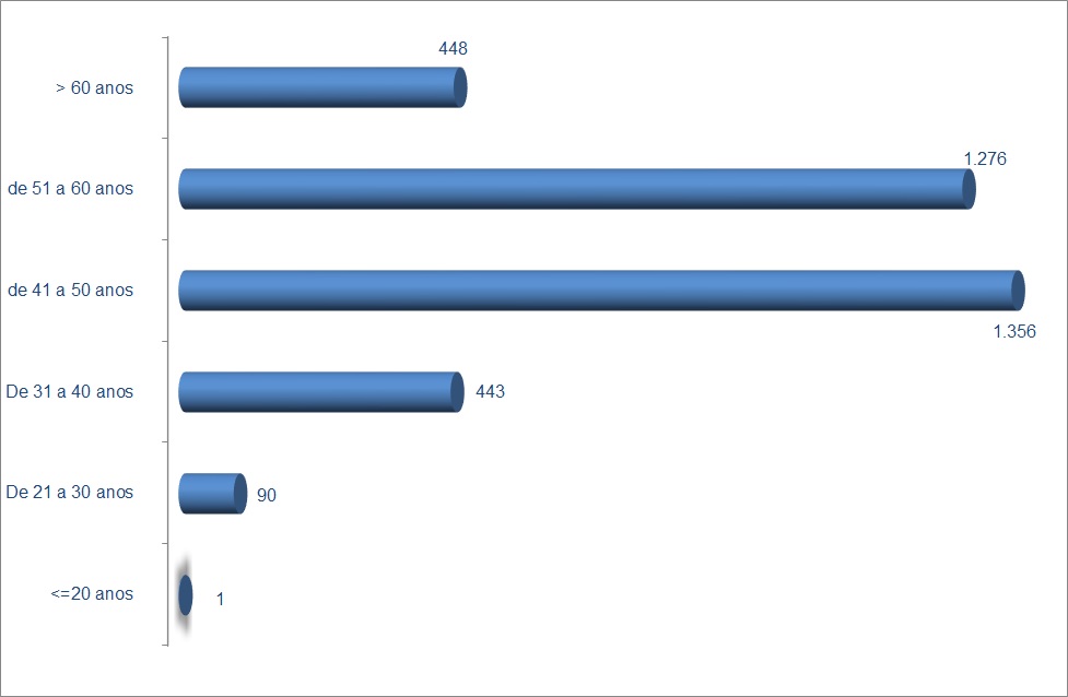 | Menor ou igual que 20 anos | De 21 a 30 anos | De 31 a 40 anos | De 41 a 50 anos | De 51 a 60 anos | Máis de 60 anos | Total | |||||||